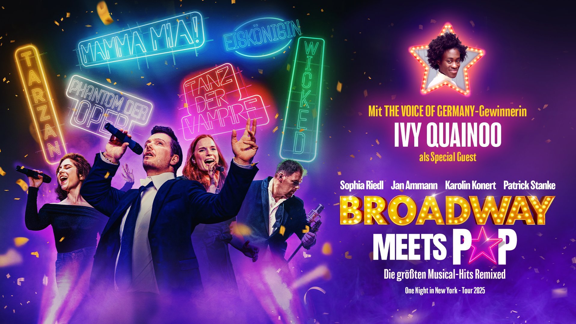 Auf dieser Bühne werden Deutschlands größte Musical-Stimmen zu gefeierten Pop-Stars: Jan Ammann (Tanz der Vampire), Patrick Stanke (Die Schöne und das Biest), Karolin Konert (Ku’damm 59) und Sophia Riedl (Wicked) sorgen für ein Musik-Spektakel, in dem die Grenzen zwischen Musical-Best-Of und Pop-Konzert der Extraklasse verschwimmen. Eine atemberaubende Lichtshow bringt die Bühne zum Pulsieren, während die Energie des Tanzensembles sowie der Live-Band alle mitreißt – kein Playback, sondern Gänsehaut pur!