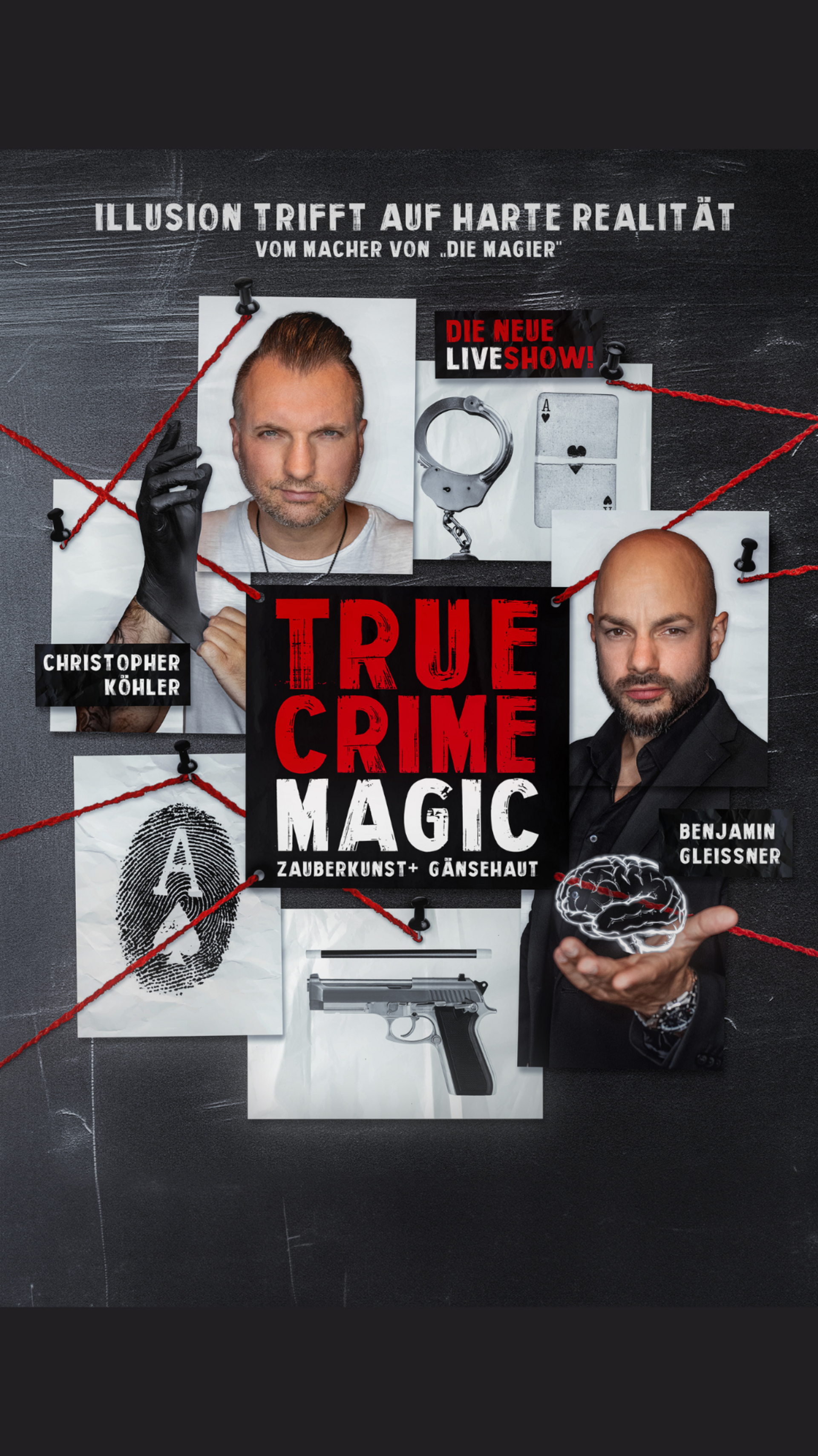 Die beiden renommierten Magier Christopher Köhler und Benjamin Gleissner stehen im Zentrum dieser einzigartigen Show. Christopher Köhler, der Macher der Erfolgsshow „Die Magier“, kehrt mit einem neuen Konzept zurück um Ihnen eine ganz neue Seite der Magie zu präsentieren. Benjamin Gleissner kennt sich mit wahren Verbrechen aus, denn außerhalb der Bühne ist er Polizist und bringt seine